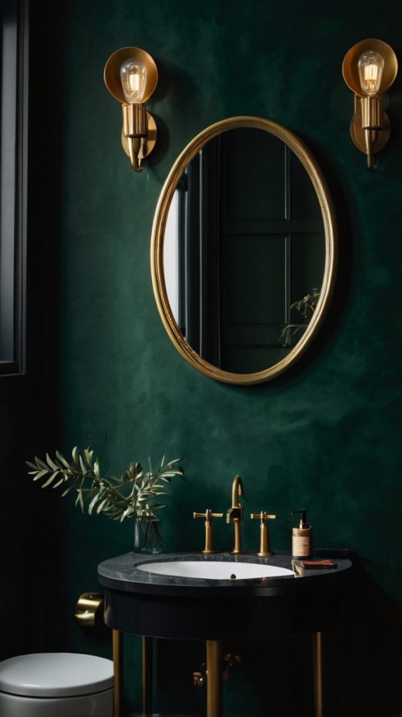 Who says bathrooms can’t be dramatic? A velvet-finish green accent wall behind your vanity creates instant focal point energy. The key word here is “velvet” – we want that subtle texture that catches light differently depending on your viewing angle.