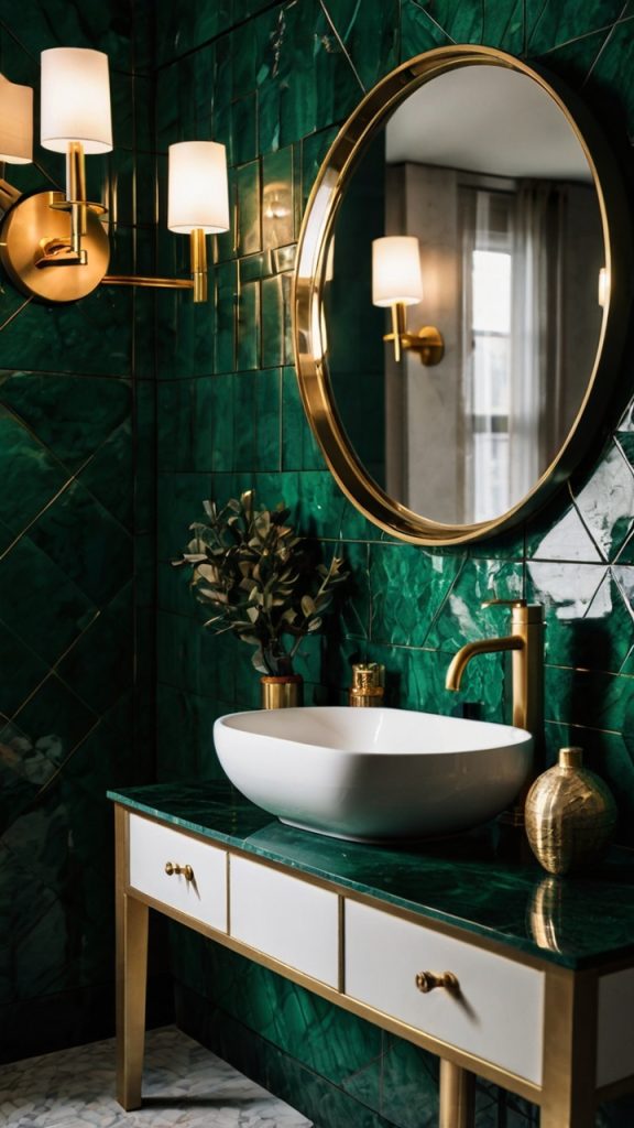 The warmth of brass prevents the emerald from feeling cold or clinical. Think brass faucets, mirror frames, and even light switches. The key lies in consistency – mixing brass with chrome or nickel breaks the spell.