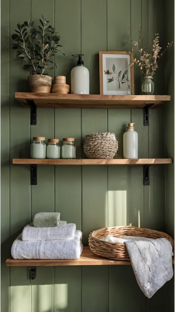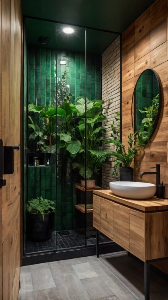 With jungle green, you absolutely need real plants. Fake ones just won’t cut it here. Pothos, snake plants, or ferns thrive in bathroom humidity and complete the vibe perfectly.