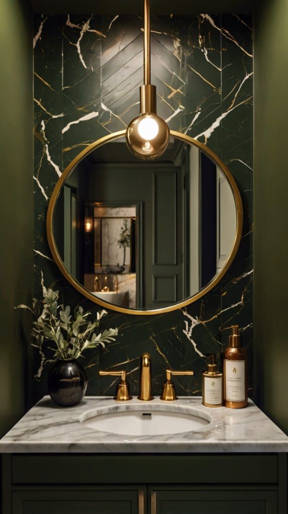 Olive green and gold together? Chef’s kiss. This combination whispers old money in the best possible way. I’m obsessed with how muted olive walls paired with brushed gold fixtures create instant sophistication.