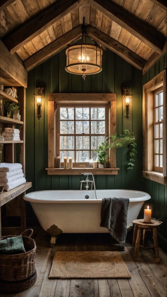 Channel your inner forest dweller with a rustic woodland green bathroom. We’re talking rough-hewn wood, natural stone, and that perfect shade of green that reminds you of moss-covered trees.