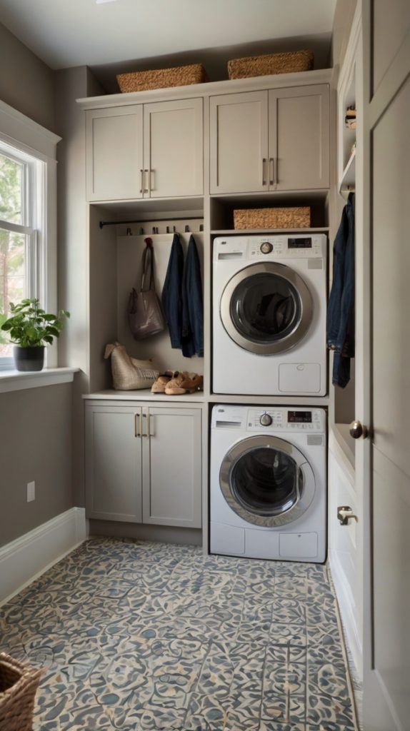 The stacked washer-dryer combo was basically invented for nooks like this. Tuck them in, add some shelving above, throw in a few hooks on the adjacent wall, and you’ve got yourself a fully functional laundry mudroom in less space than most people’s pantries.