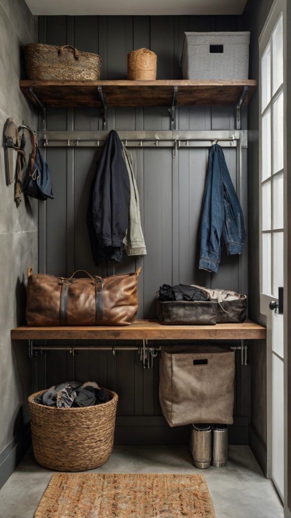 Start from the ceiling and work your way down. Crown molding shelving provides storage for items you rarely use. Mid-level gets the everyday stuff. Lower hooks handle backpacks and coats. The system works because everything has its height-appropriate place.
