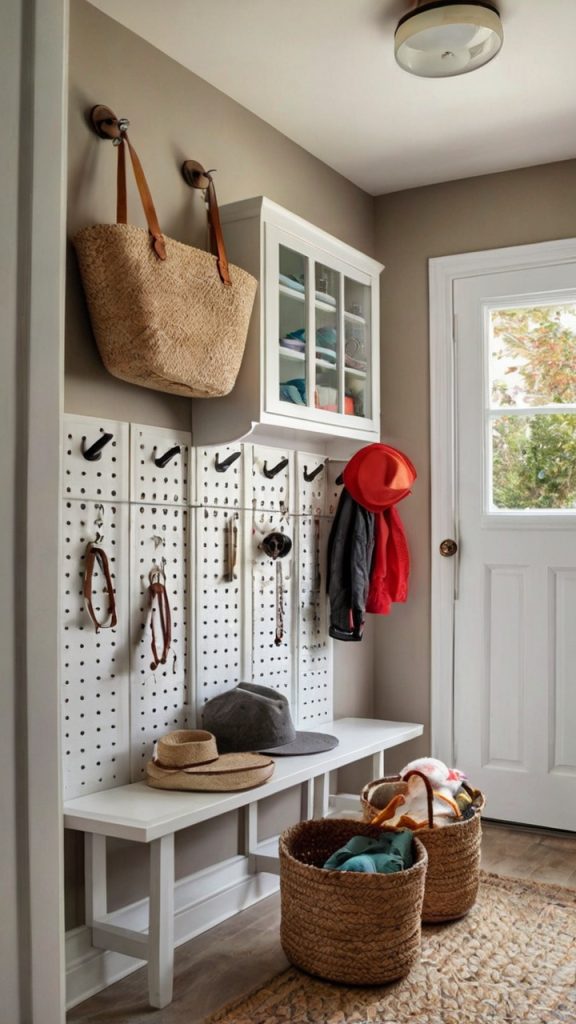 Remember pegboards from your dad’s garage? Modern pegboard systems have gotten a serious makeover, and they’re perfect for narrow mudrooms. Install one from floor to ceiling, and suddenly you’ve got customizable storage that adapts to your changing needs.