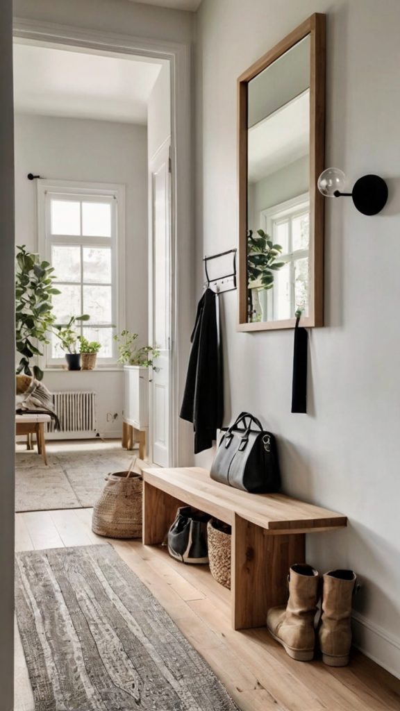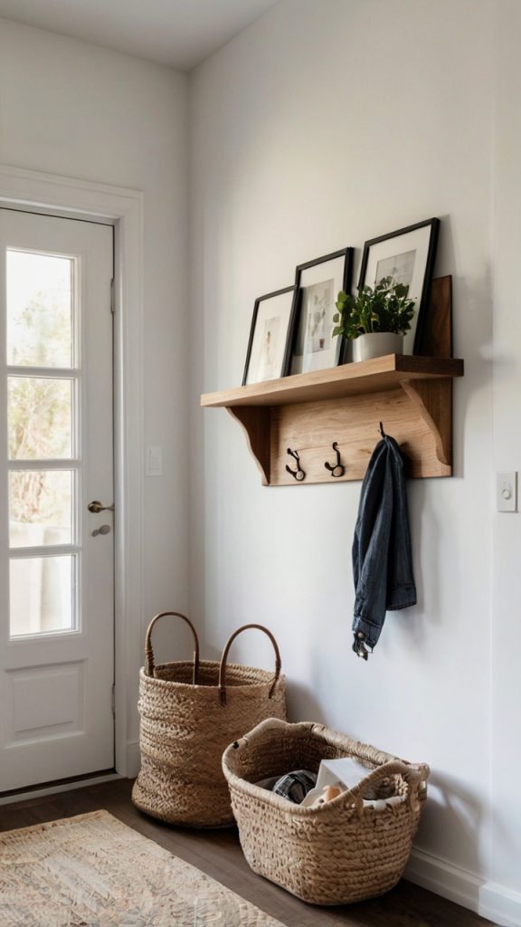 Sometimes you just need a landing spot for keys, wallets, and that pile of mail you swear you’ll sort through tomorrow. Minimalist wall shelves provide just enough surface without overwhelming your narrow space.