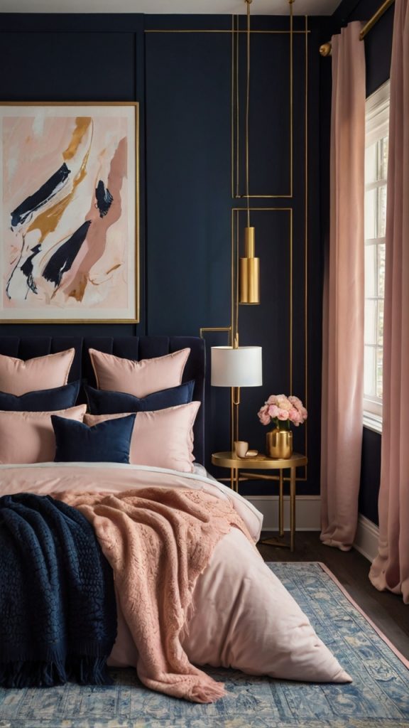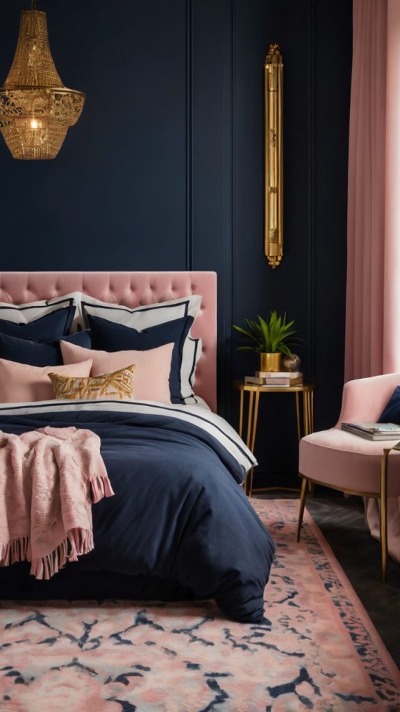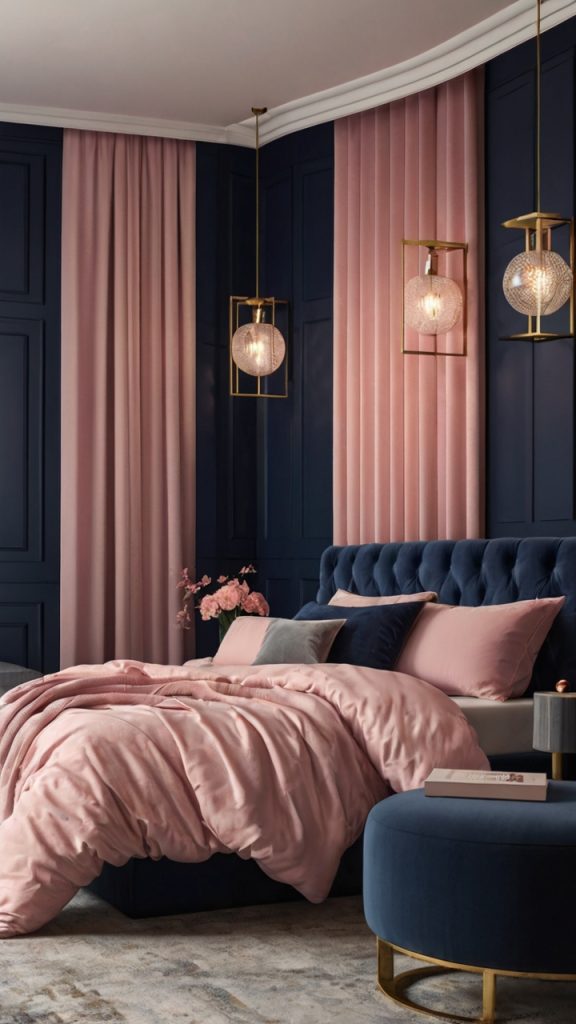 Metallic accents elevate everything. Rose gold table lamps, brass picture frames, or copper drawer pulls add that luxe factor. The warmth of these metals complements both navy and pink beautifully.