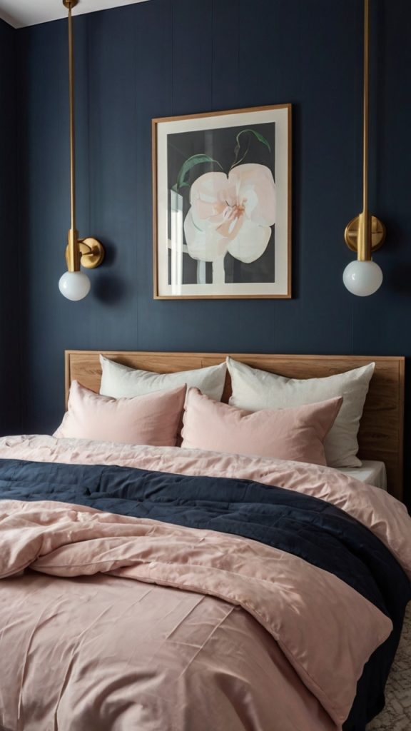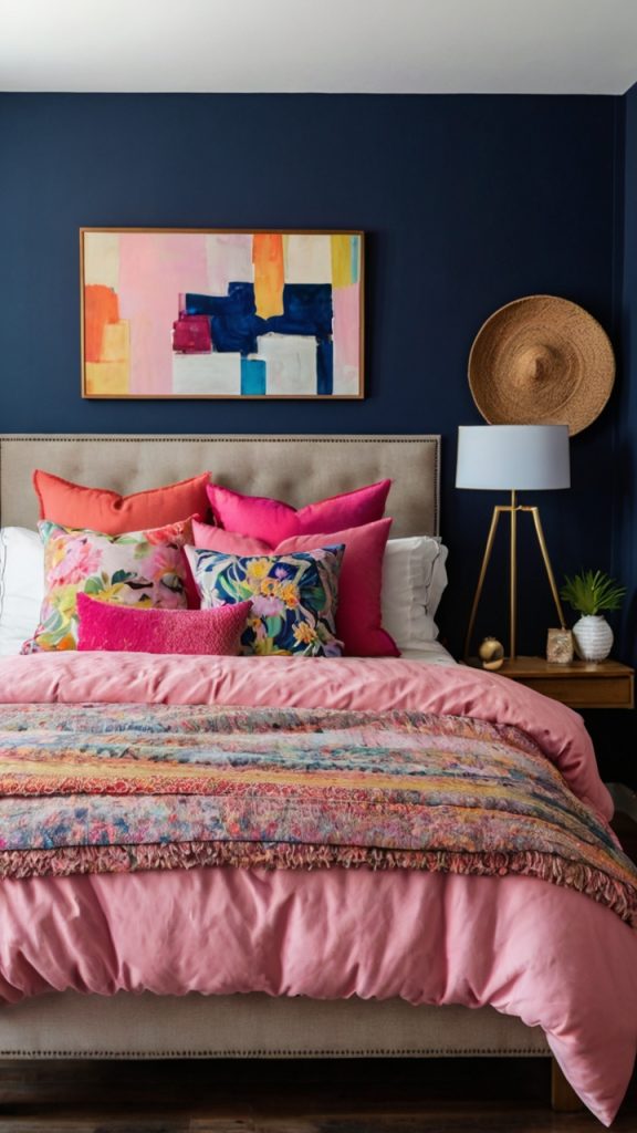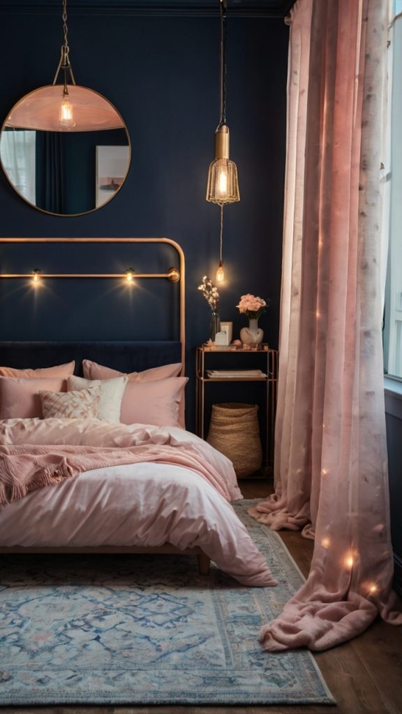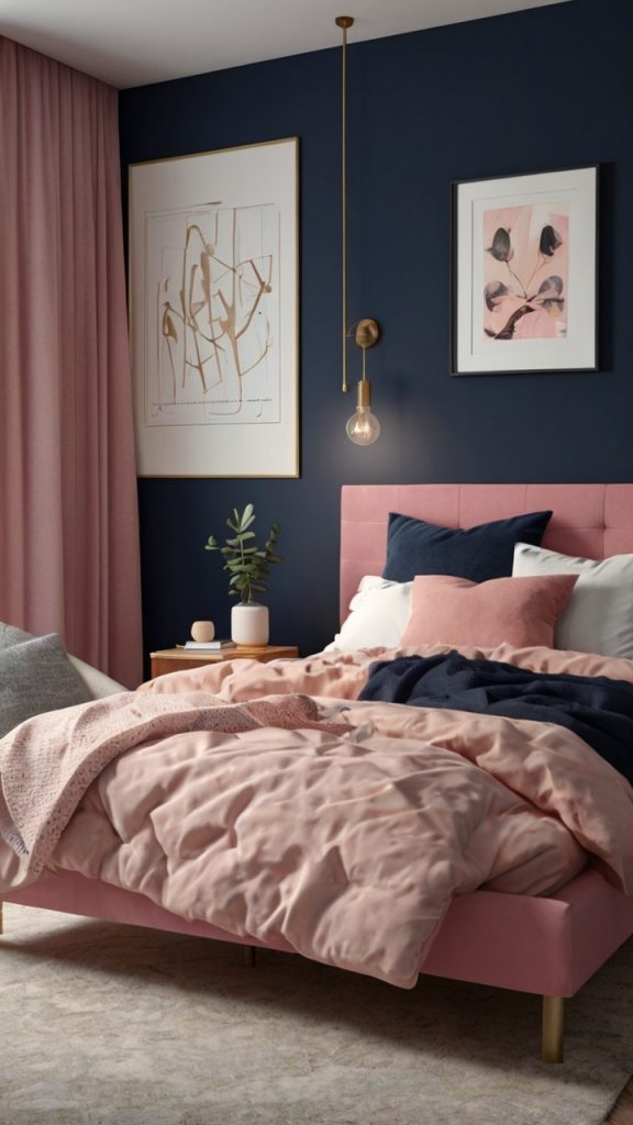 I recommend starting with your biggest surfaces first. Paint one accent wall in deep navy – it creates instant drama and makes the room feel cozy. Then layer in pink through your bedding, curtains, or artwork. You don’t need to repaint everything; sometimes just switching out your throw pillows and adding a pink lamp can completely change the vibe.