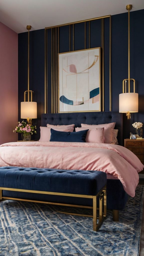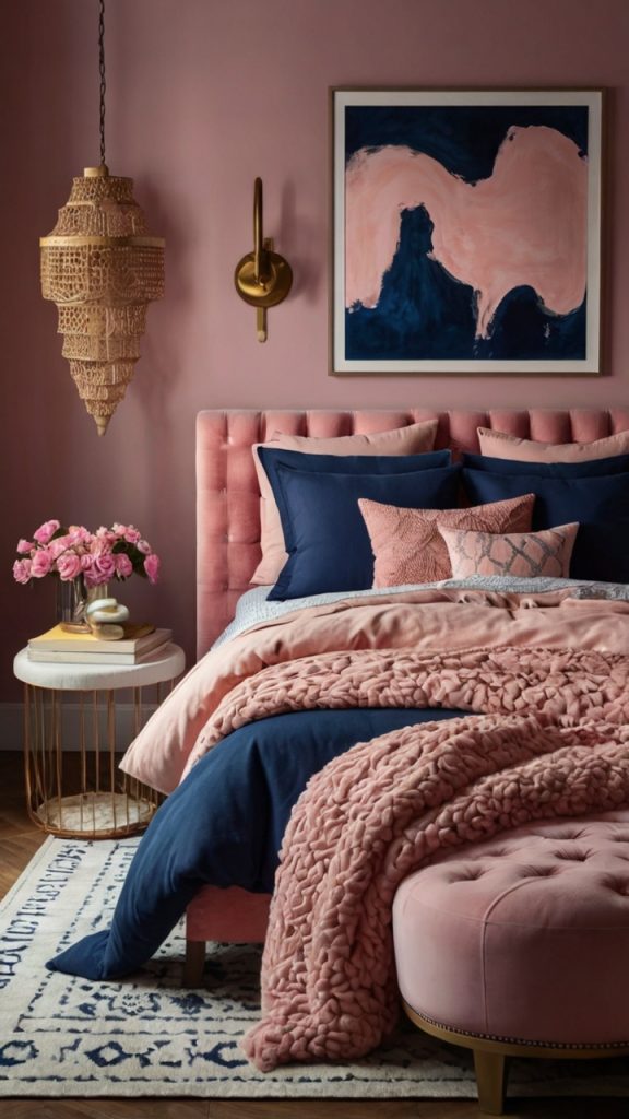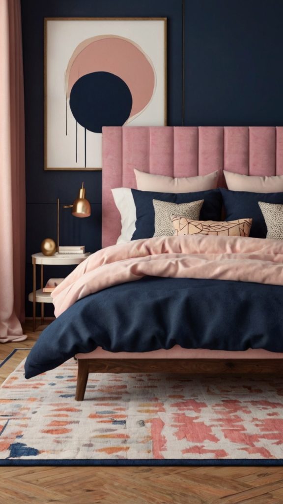 Keep furniture minimal and let the colors do the talking. A sleek navy platform bed paired with geometric pink wall art? Chef’s kiss. Modern doesn’t mean cold – incorporate warm metals like copper or rose gold in your fixtures to tie the pink and navy together.
