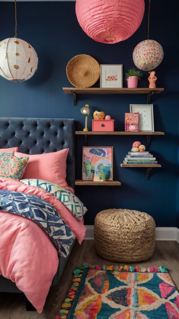 Small bedrooms actually benefit from bold color choices (shocking, I know). Dark navy on one wall creates the illusion of depth, making your room feel larger than it is. Pink accents keep it from feeling heavy.