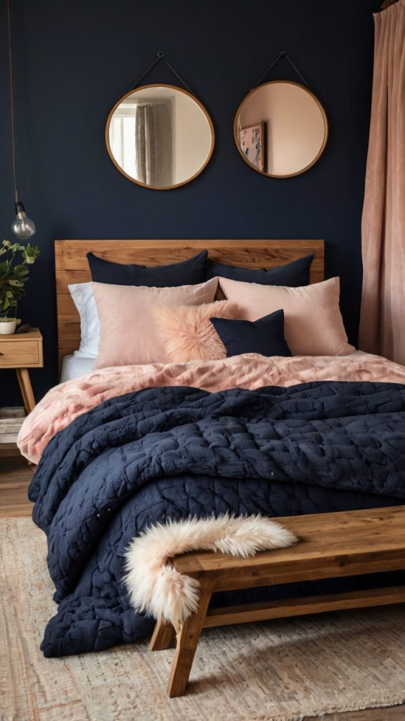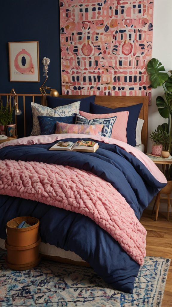 Creating a cozy bedroom isn’t just about throwing blankets everywhere (though that definitely helps). It’s about building layers that make you want to burrow in and never leave. Navy naturally creates that cocoon feeling, while pink adds warmth that keeps it from feeling too cave-like.