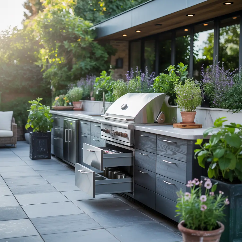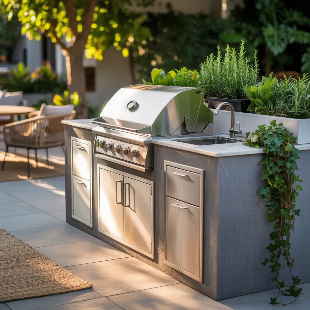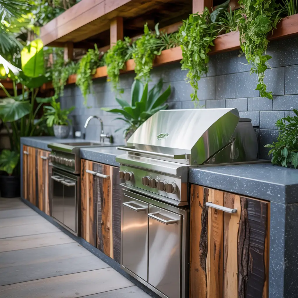 Going green with your outdoor kitchen feels good and looks great. Sustainable designs use reclaimed materials, energy-efficient appliances, and smart water management. Plus, they often cost less in the long run!