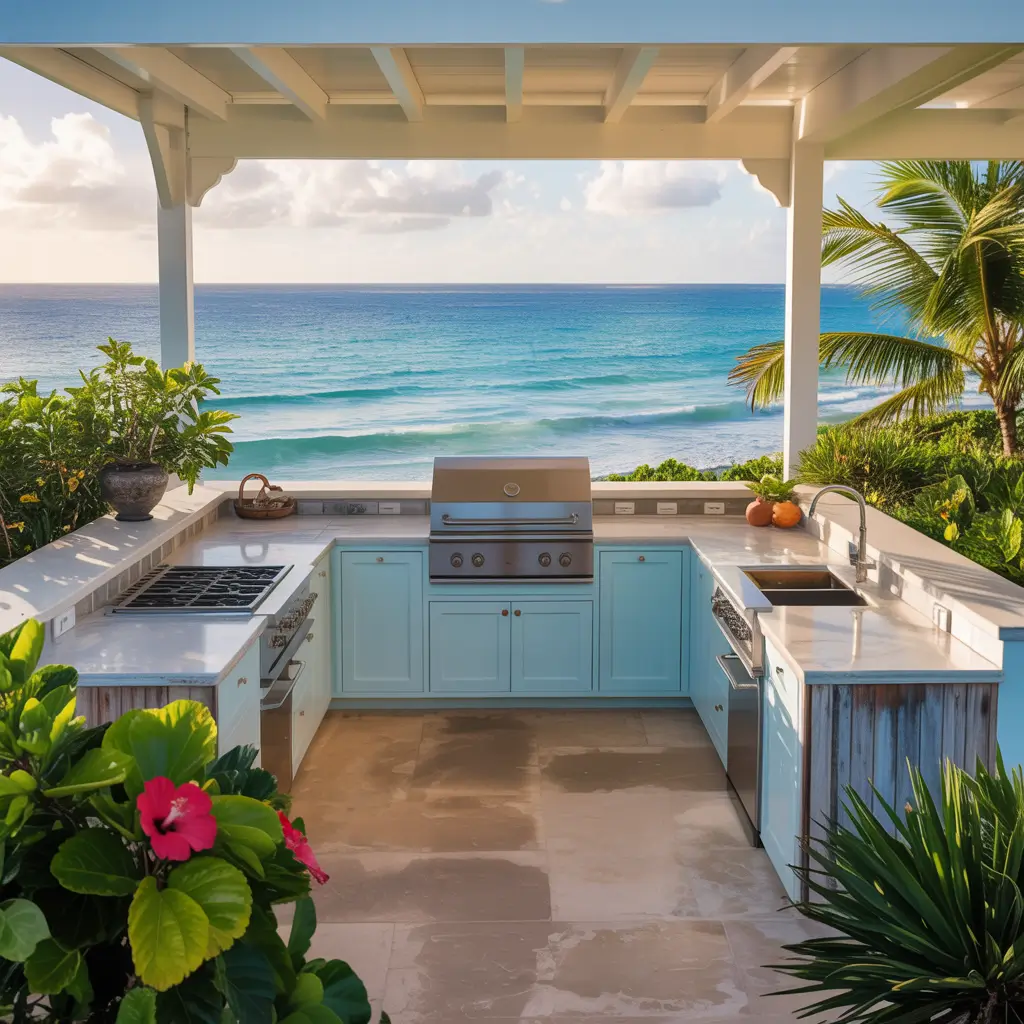 Tropical kitchens embrace bold colors, natural materials, and abundant greenery. Think tiki-bar meets sophisticated outdoor dining. The atmosphere matters as much as the appliances here.