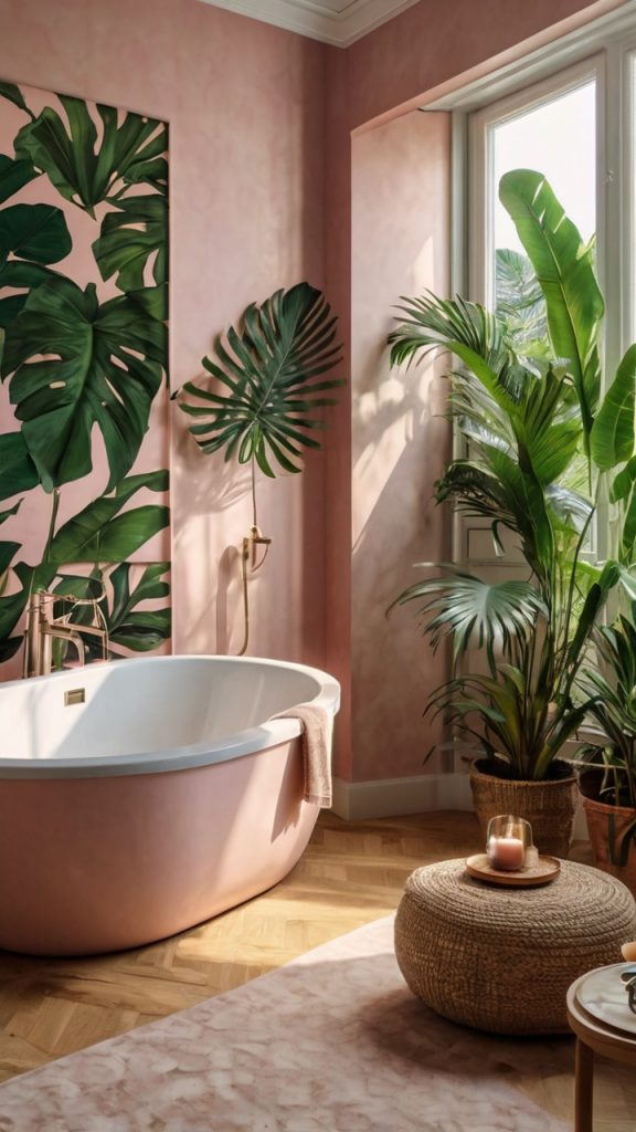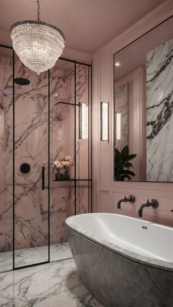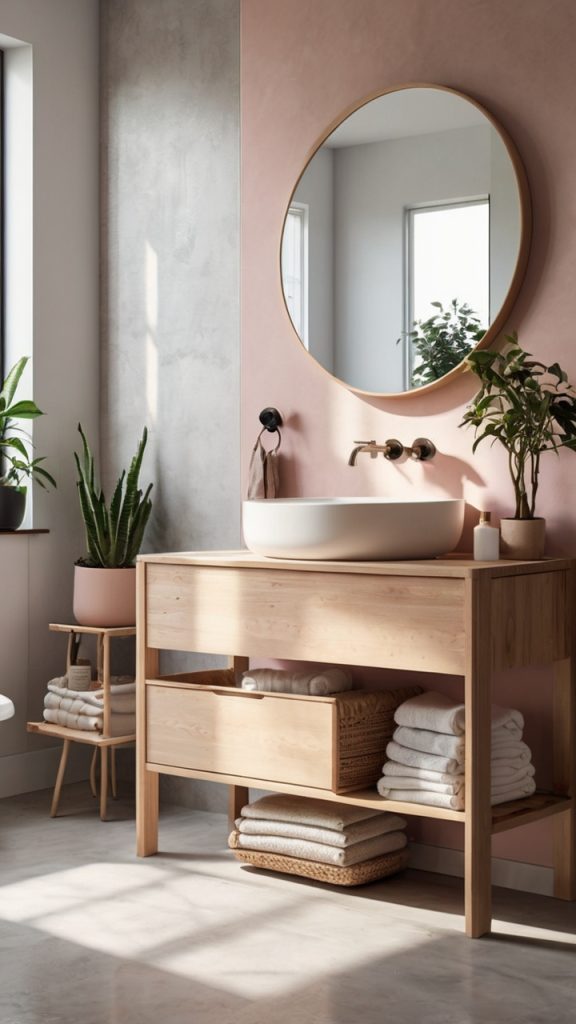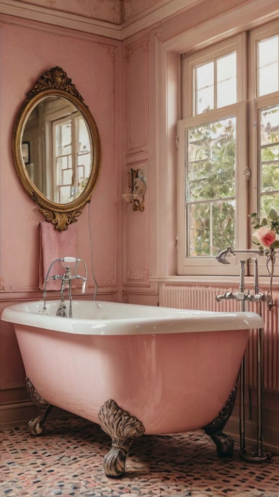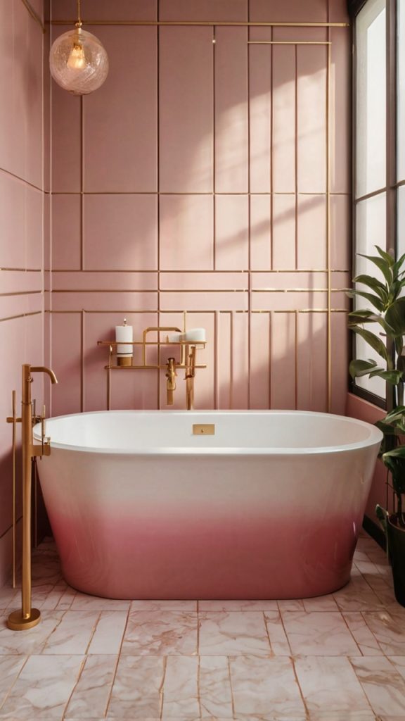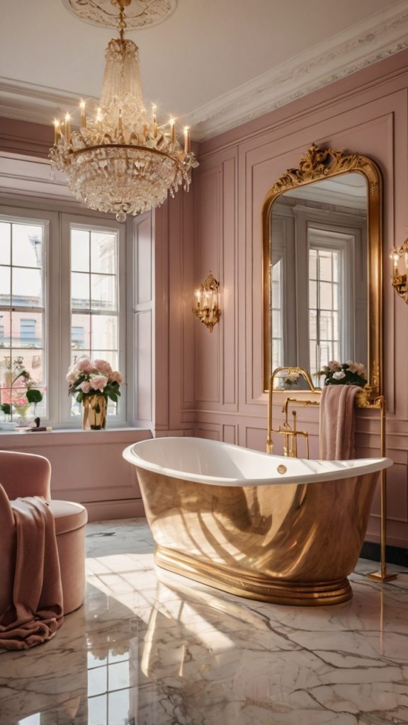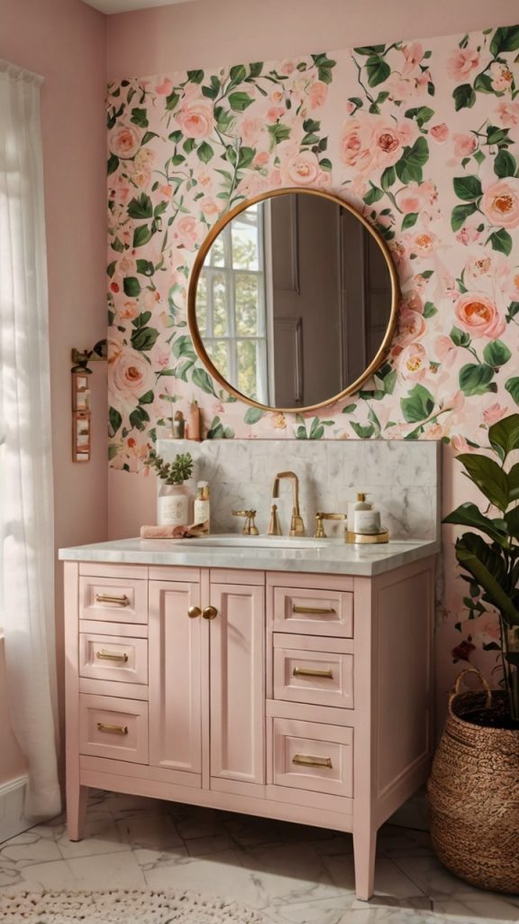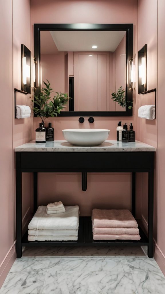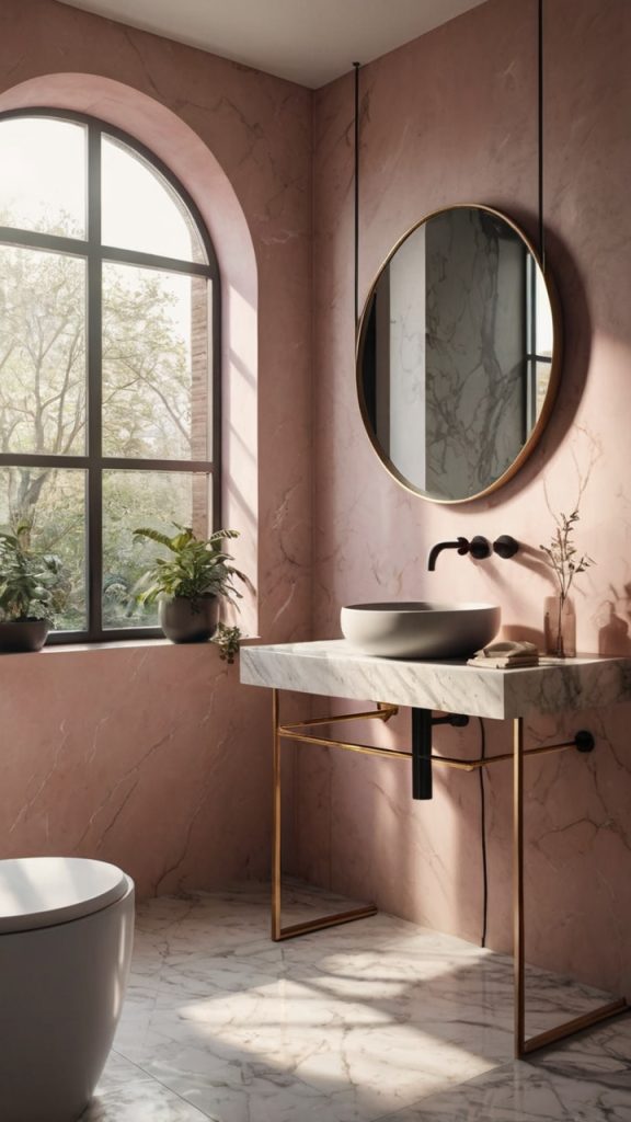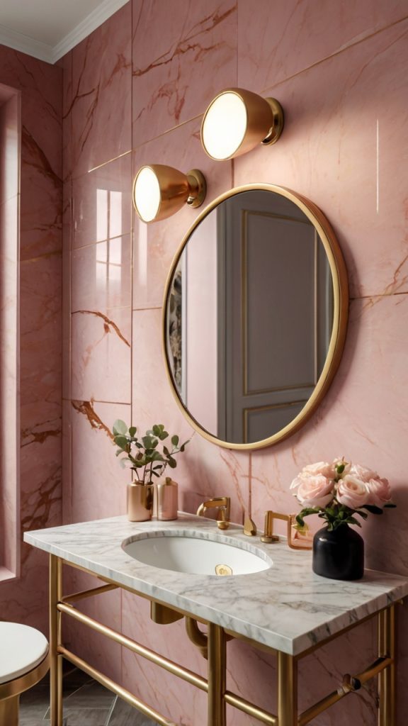 Start with a base of soft pink walls – maybe a warm blush or peachy pink. Then bring in the gold through your hardware: faucets, drawer pulls, mirror frames, and light fixtures. The contrast creates instant luxury. I splurged on gold-framed mirrors for my master bath, and every morning feels like I’m getting ready in a fancy hotel.
