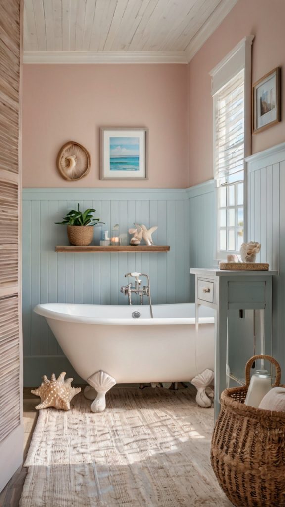 Forget blue – pink coastal bathrooms capture that sunset-over-the-ocean vibe perfectly. This aesthetic brings beach house charm without the cliché nautical themes. Think coral pink, seashell tones, and sandy neutrals.