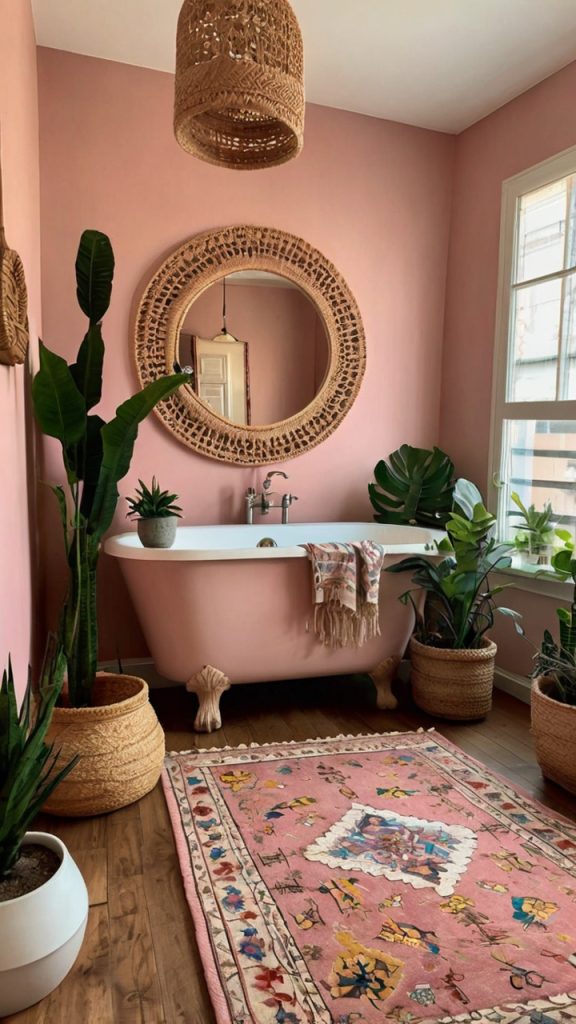 The blush pink boho bathroom is for free spirits who want their space to feel like a warm, eclectic hug. This isn’t about perfection; it’s about personality. Mix patterns, textures, and shades of pink like you’re creating a mood board for your soul.