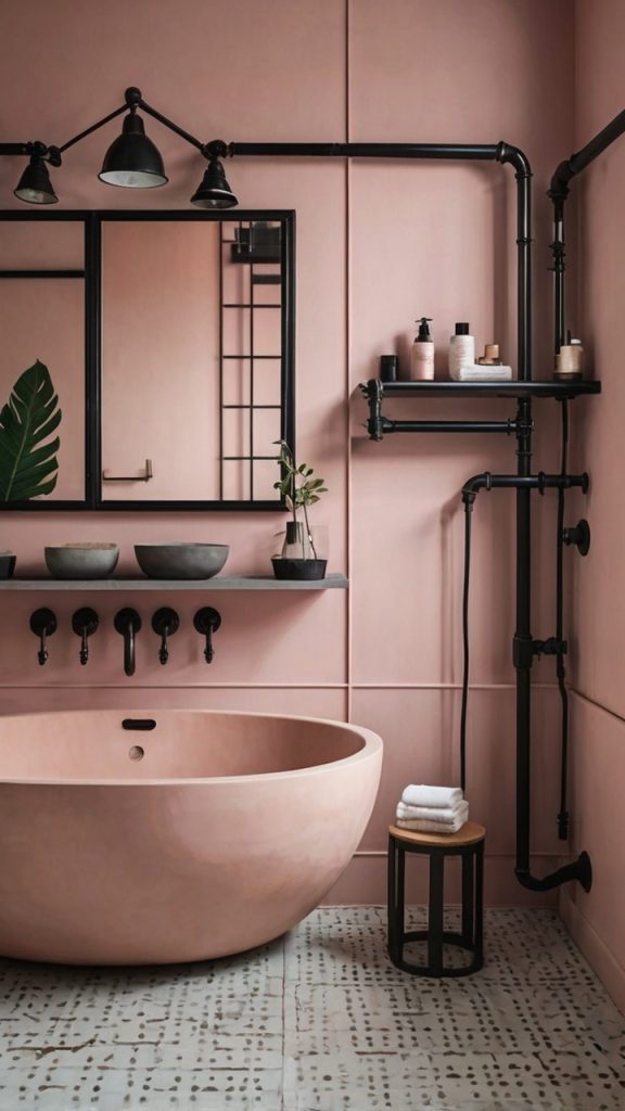 Exposed pipes, concrete surfaces, and metal fixtures get softened by strategic pink elements. Think pink accent walls against raw concrete, or a pink vanity with industrial pipe shelving. The contrast keeps things interesting.