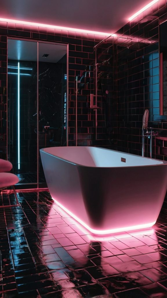 A single pink neon sign – maybe “Good Vibes” or just an abstract shape – transforms your bathroom into a vibe. The pink glow creates ambiance that regular lighting can’t touch. Plus, it looks incredible in photos (because if you didn’t Instagram it, did it even happen?).