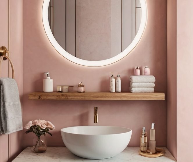Start with a base of soft pink walls – maybe a warm blush or peachy pink. Then bring in the gold through your hardware: faucets, drawer pulls, mirror frames, and light fixtures. The contrast creates instant luxury. I splurged on gold-framed mirrors for my master bath, and every morning feels like I’m getting ready in a fancy hotel.