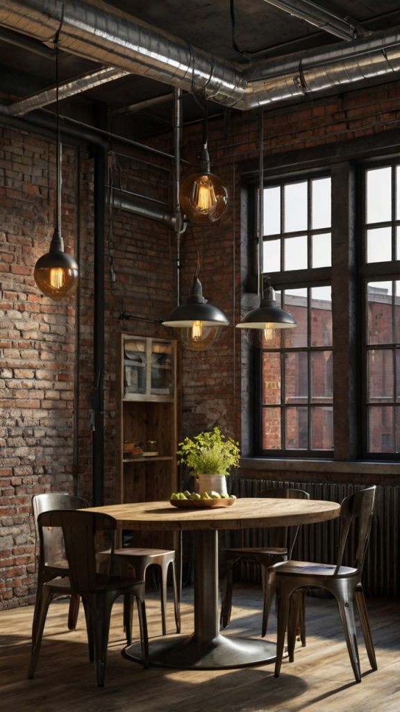 The beauty of industrial is you can go raw and unfinished. Exposed brick walls, metal chairs, Edison bulb lighting—it all works together. My buddy has this sick setup with a round concrete table (yes, concrete!) and metal stools. Looks like it belongs in a converted warehouse.