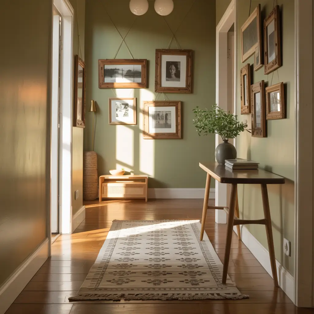 Consider creating a salon-style gallery wall that runs the entire length of your hallway. Start with your largest piece at eye level and build out from there. The sage green background ties everything together, even if your art styles vary wildly.