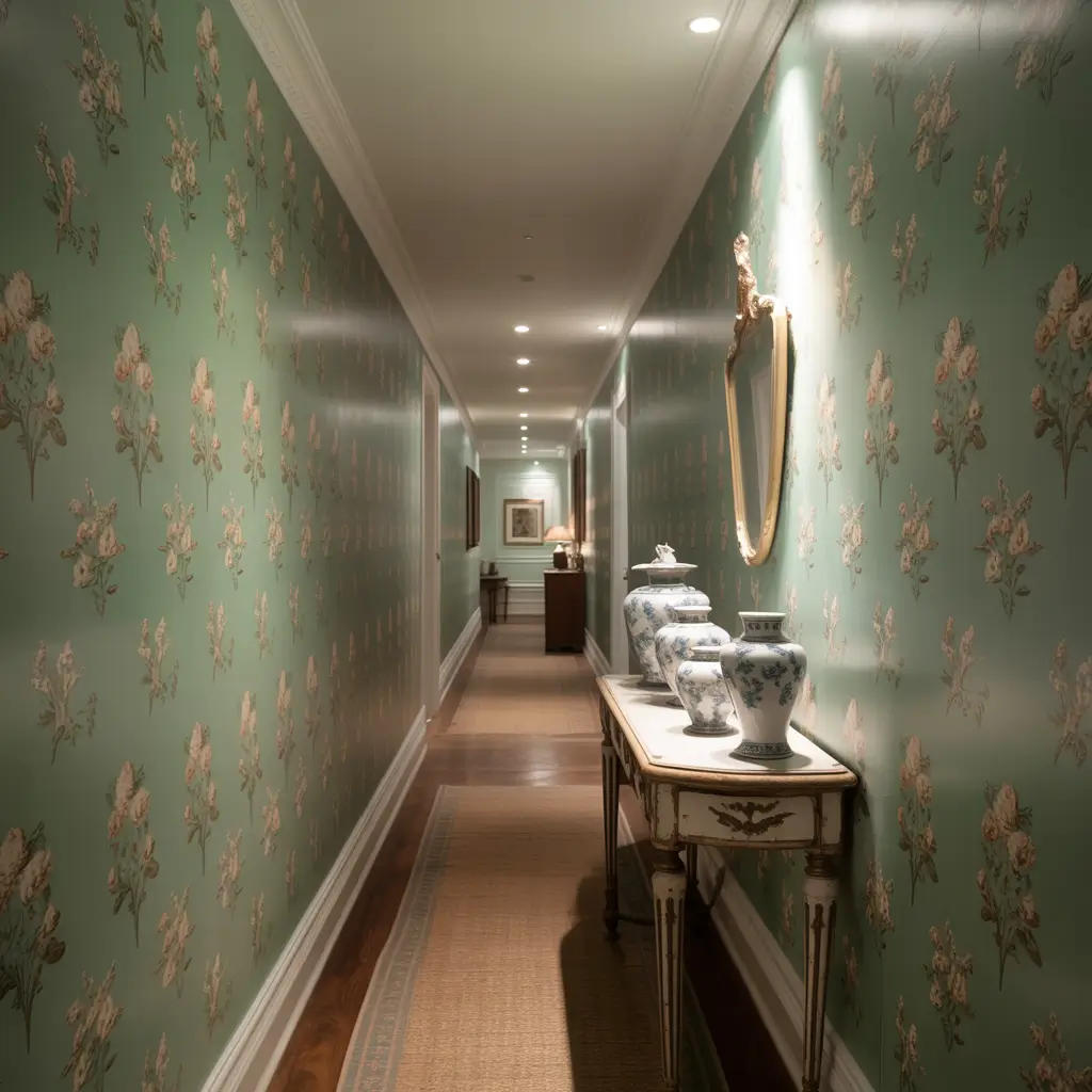 Sage Green Hallway with Patterned Wallpaper