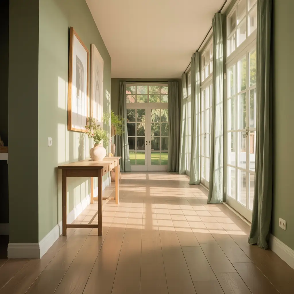 Bright Sage Green Hallway with Natural Light