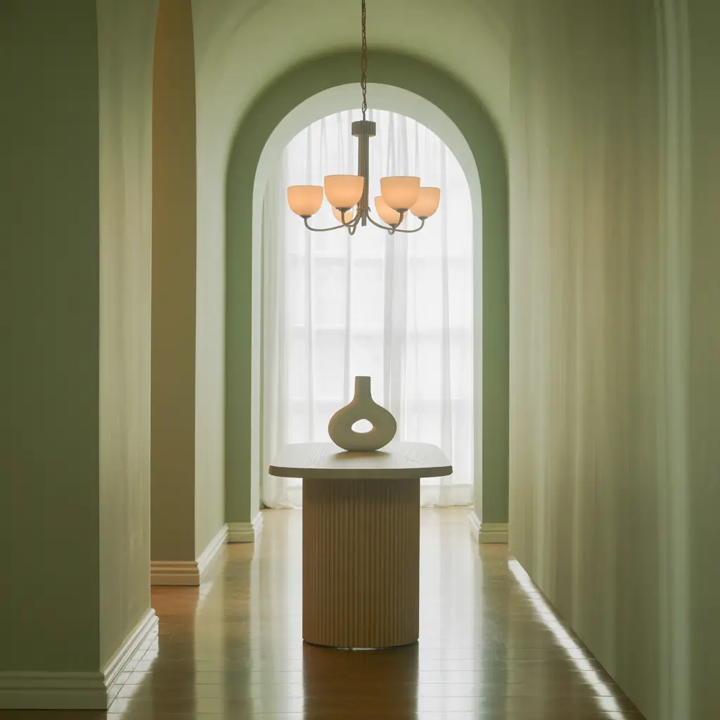 Sage Green Hallway with Statement Lighting