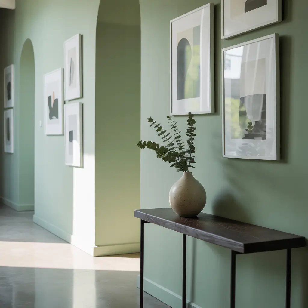 Art lovers, this one’s for you. A sage green hallway provides the perfect gallery-style backdrop for showcasing your collection without overwhelming the pieces.