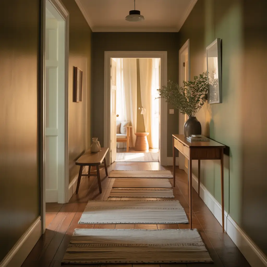 Sage Green Hallway with Cozy Rug Layers