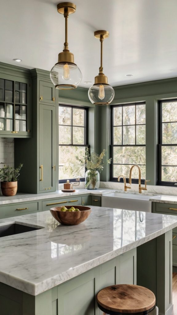 Let’s kick things off with the combo that makes interior designers weak in the knees. Sage green cabinets paired with marble countertops create this insanely sophisticated look that somehow manages to feel both luxurious and approachable. The cool undertones in the marble play perfectly against the warmth of sage green, creating this balanced aesthetic that just works.