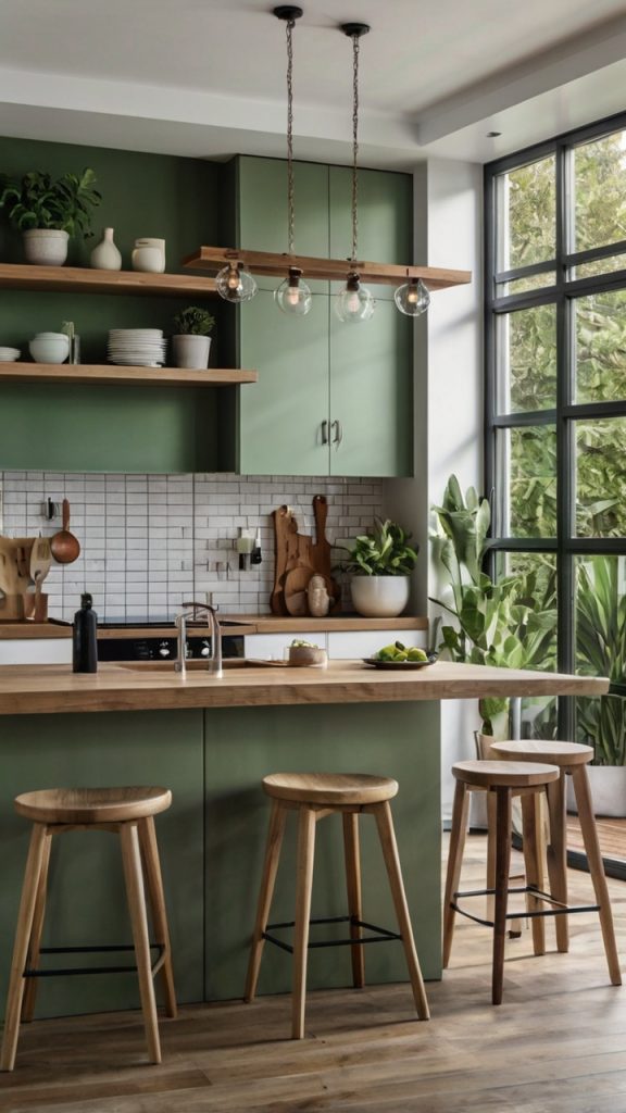 Don’t forget seating! The right bar stools can complement or contrast with your sage green. Leather, wood, or metal all work depending on your overall aesthetic.