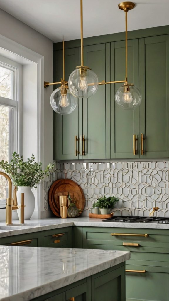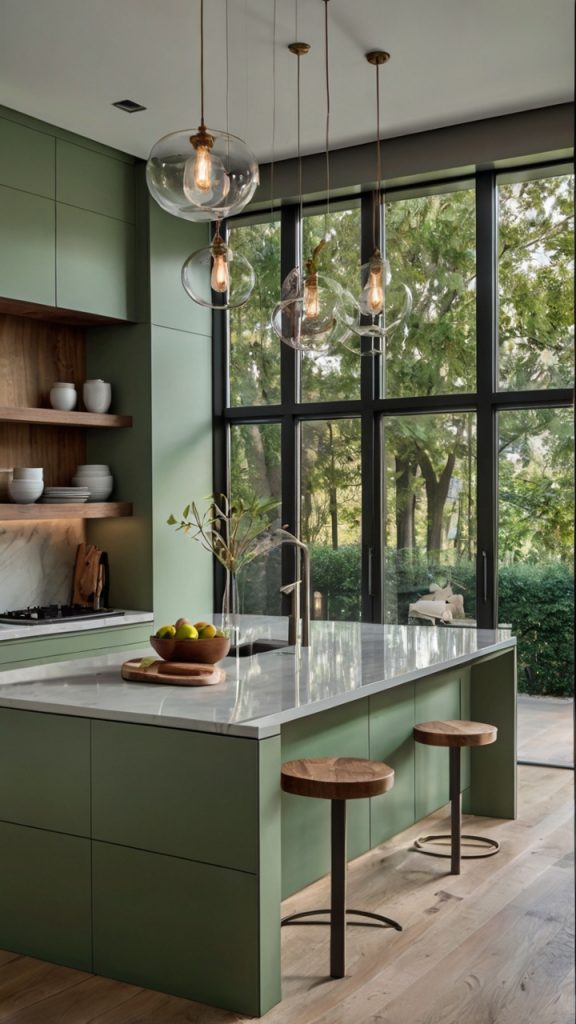 Pendant lights over an island in aged brass or black metal complement sage green beautifully. Under-cabinet LED strips eliminate shadows and make the space feel bigger. Don’t forget about natural light – sage green looks absolutely incredible in morning sunlight.