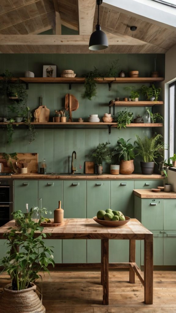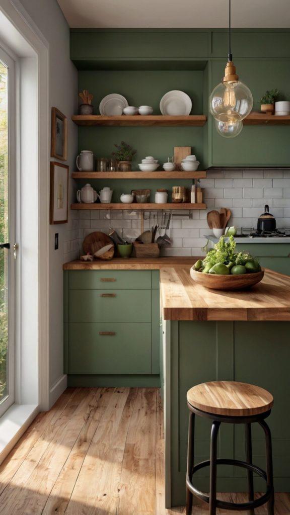 Floating shelves in natural wood or black metal against sage green walls? Absolutely stunning. You get storage, display space, and this visual break that prevents the kitchen from feeling too heavy. Plus, let’s be honest – open shelving forces you to keep things organized, which IMO is a good thing.