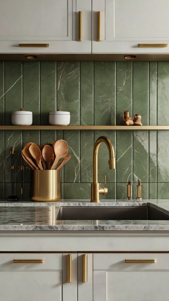 Your backsplash offers the perfect opportunity to complement or contrast with sage green cabinets. Subway tile remains classic – white creates clean contrast, while sage green tiles create a monochromatic moment. Natural stone, especially marble or travertine, brings organic texture that enhances sage green’s earthiness.