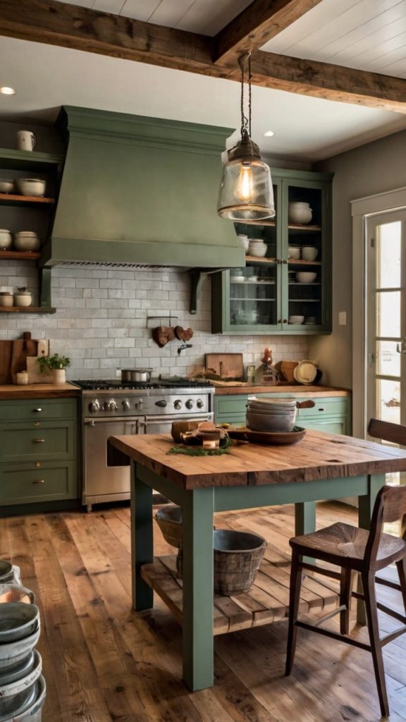 Can we talk about how sage green basically owns the farmhouse aesthetic? This color looks like it was specifically invented for shiplap walls and apron-front sinks. The rustic sage green farmhouse kitchen takes everything cozy about country style and gives it this fresh, modern update that doesn’t feel like you’re living in a time capsule.