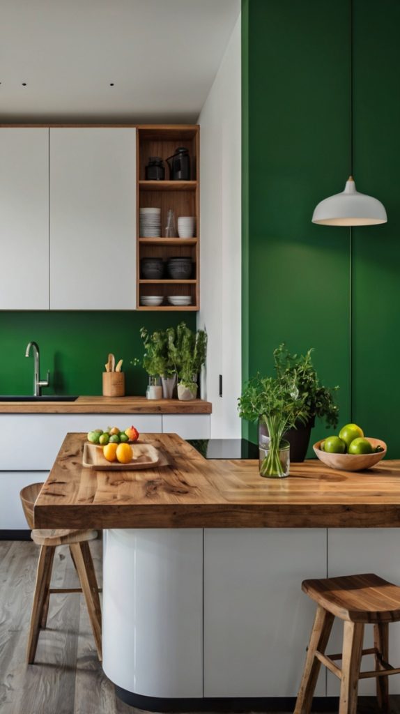 Floating shelves in natural wood or black metal against sage green walls? Absolutely stunning. You get storage, display space, and this visual break that prevents the kitchen from feeling too heavy. Plus, let’s be honest – open shelving forces you to keep things organized, which IMO is a good thing.