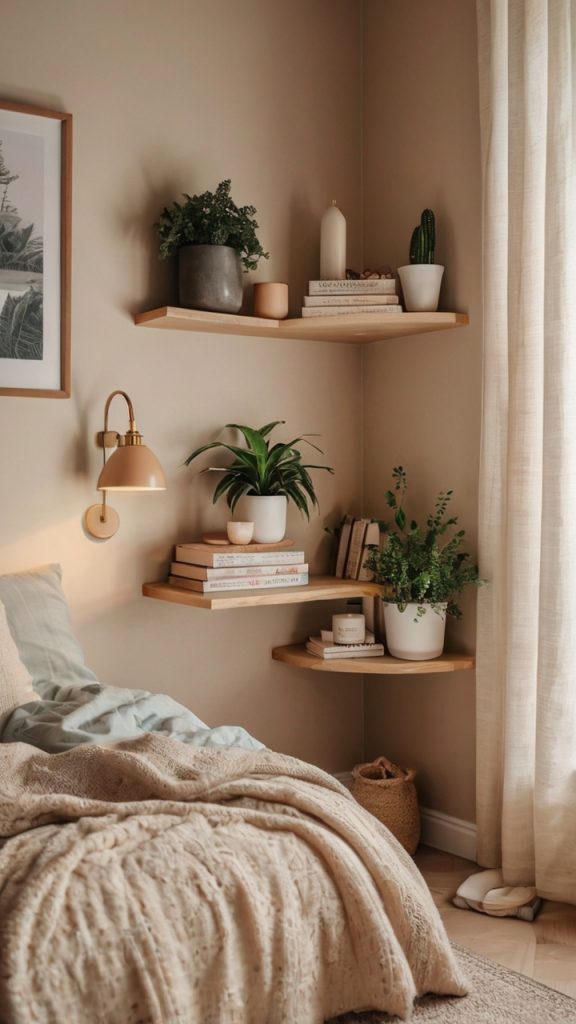 Corners – the forgotten real estate of bedrooms everywhere. Corner floating shelves transformed my awkward bedroom corner from dead space into a focal point. Who knew that weird angle could actually work in my favor?