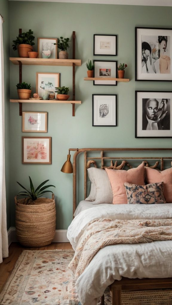 Why choose between shelves and a gallery wall when you can have both? I discovered this hybrid approach completely by accident when I ran out of wall space. Now it’s my favorite bedroom feature.