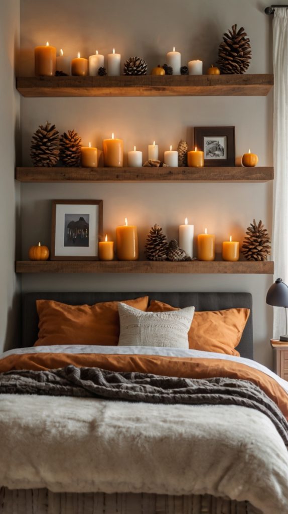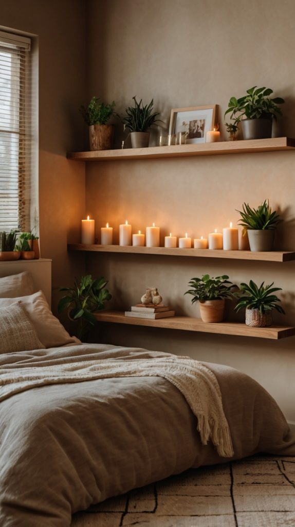 Want instant bedroom ambiance? Tiered shelves filled with candles create the most romantic, relaxing atmosphere. I installed three shelves at different depths, creating a cascading effect that looks stunning when lit.