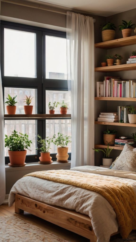 Combining books and plants on shelves? Chef’s kiss. This combo brings life and personality to any bedroom. I arrange my shelves with books both vertically and horizontally, using the horizontal stacks as pedestals for small plants.