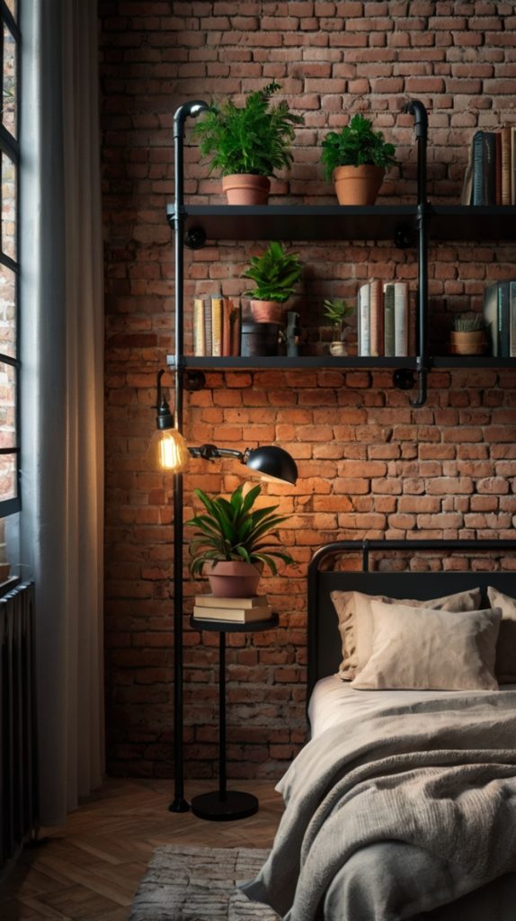 The raw, unfinished look of pipe shelving provides the perfect backdrop for mixing textures. I display leather-bound journals, metal bookends, and Edison bulb lamps. The contrast between rough industrial elements and softer bedroom décor creates this amazing tension.