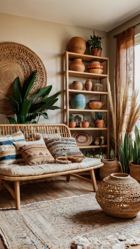 - Natural materials like rattan, jute, and wood