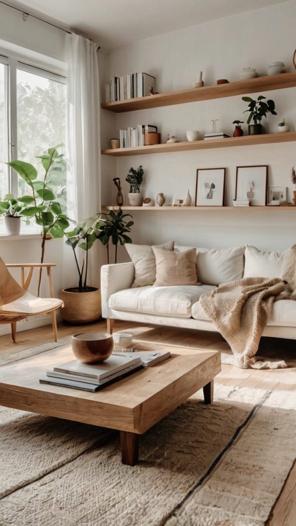 Natural elements play a starring role. Incorporate blonde wood accessories, white ceramics, and maybe a sheepskin throw draped casually over a shelf edge. Add one or two black accents for contrast – Scandinavian design loves that light-dark balance.