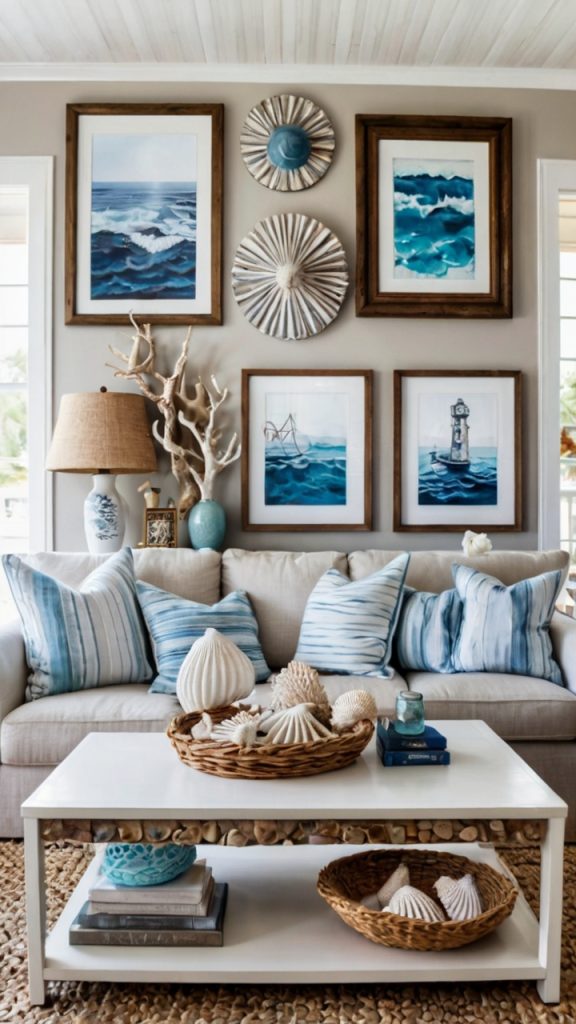 Colors stay light and airy – think whites, soft blues, sandy beiges, and seafoam greens. Natural materials like weathered wood, rope, and woven grass complement the palette perfectly. I’ve found that adding one unexpected element, like a piece of coral-colored ceramic, prevents the look from feeling too predictable.