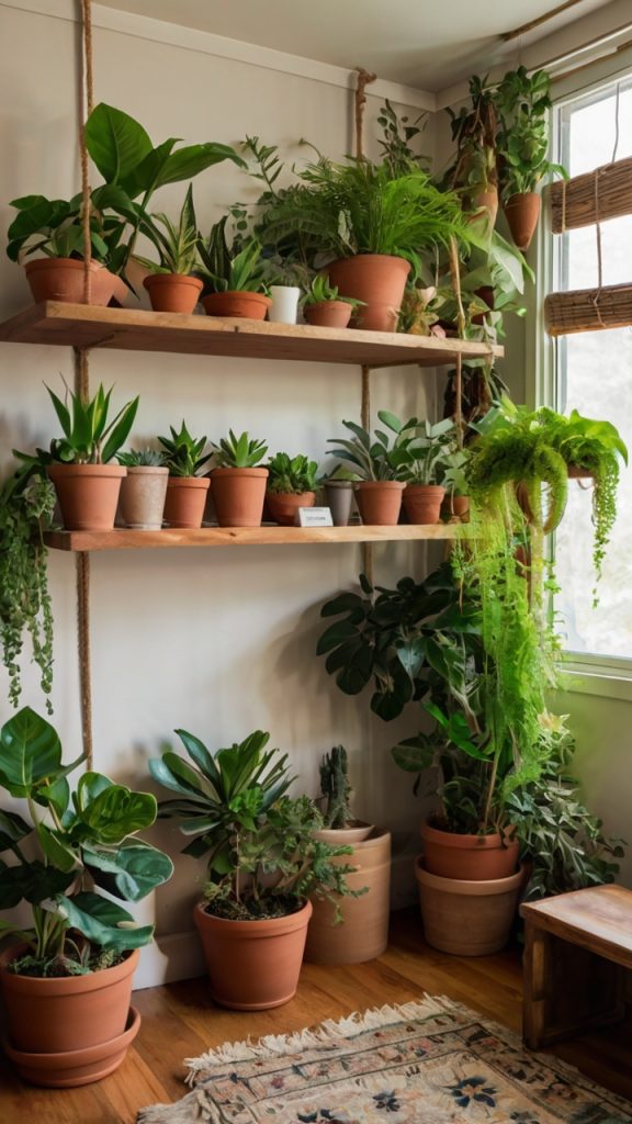 Mix plant heights and types for maximum impact. Tall snake plants create vertical interest, while trailing philodendrons soften harsh shelf edges. Cluster small succulents for a mini garden effect. The variety keeps your eye moving and makes the display feel intentional rather than random.