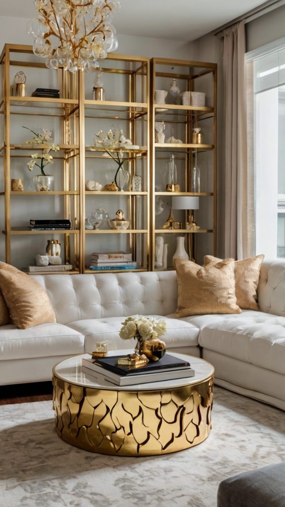 Want shelves that feel fancy without the trust fund? Gold accents deliver luxury on any budget. The trick is using gold as an accent, not the main event – unless you’re going for that King Midas look.