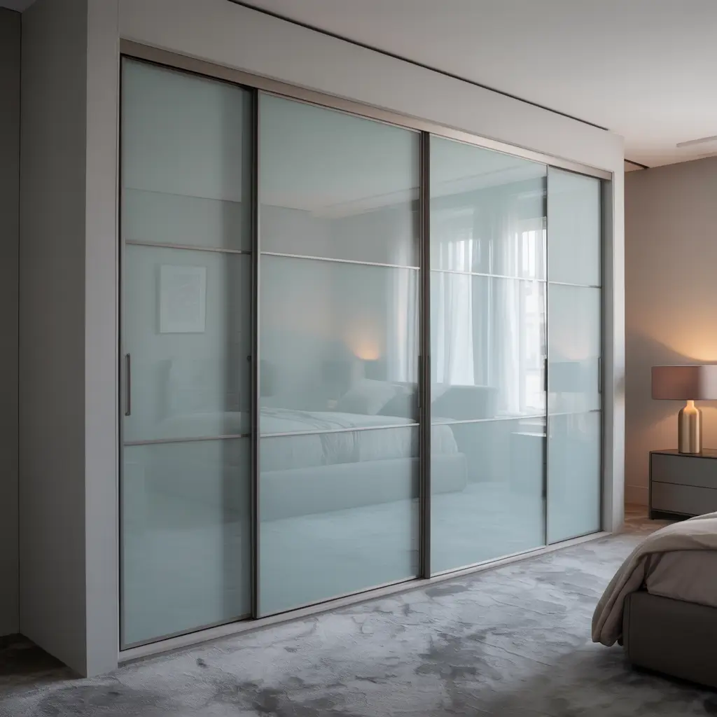 Frosted glass gives you the best of both worlds – it lets light through while hiding the inevitable clothing chaos inside. I have frosted panels in my guest room wardrobe, and visitors always comment on how elegant it looks.