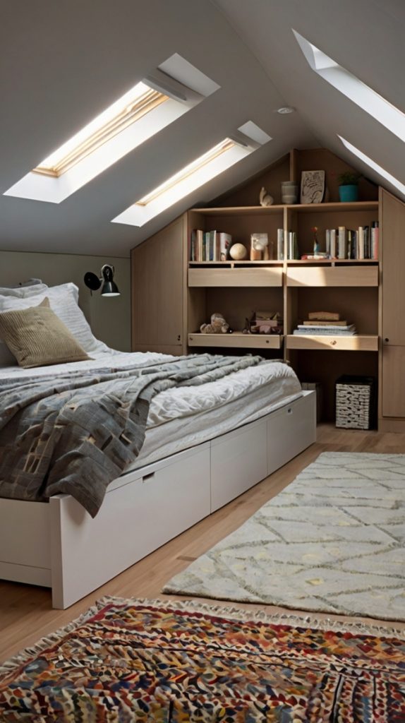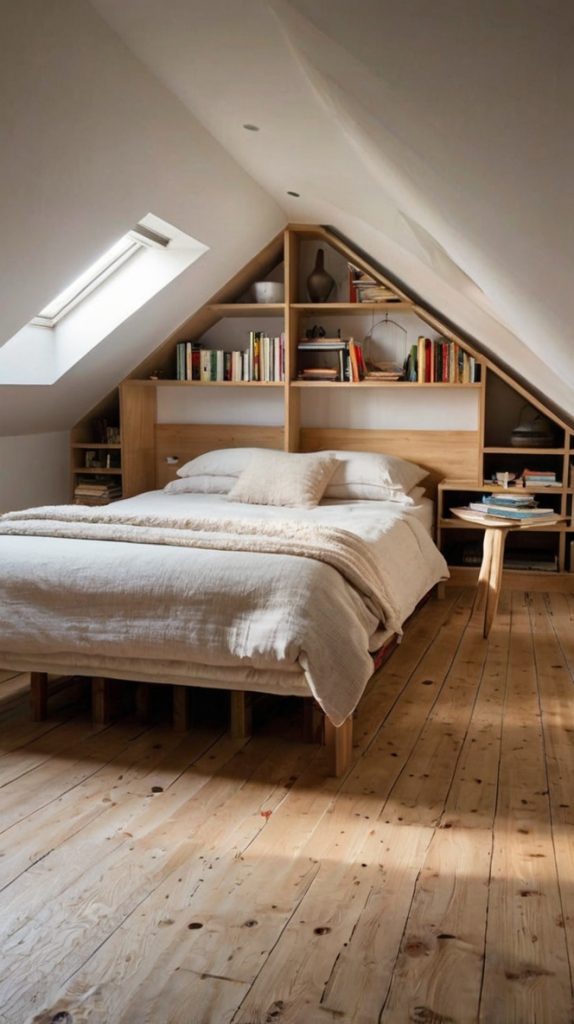 I’ve seen built-in beds that tuck perfectly under eaves, desks that follow the roofline, and wardrobes that disappear into walls. My own attic has built-in shelving that follows the slope of the ceiling. Looks like it was always meant to be there.