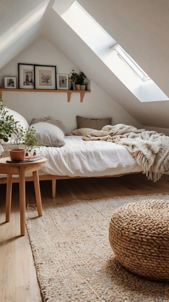 For furniture, think low and horizontal. Platform beds work brilliantly here because they don’t compete with the slanted ceiling. Add some floor cushions, maybe a low-sitting armchair, and you’ve got yourself a proper retreat. Trust me, once you nail this look, you’ll wonder why anyone bothers with regular bedrooms.