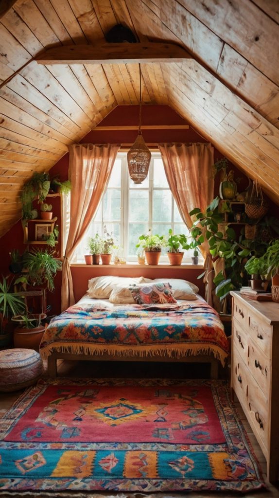 Layer, layer, layer – that’s the boho mantra. Start with a low platform bed (or just a mattress on the floor – very boho). Add colorful textiles, macramé wall hangings, and plants cascading from every available surface. My attic bedroom looks like a jungle met a textile market, and I love it 🙂
